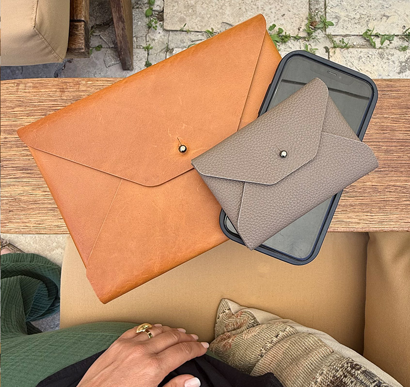 Housses d’ordinateur et de tablette, porte-cartes, porte-passeport, conférenciers, pochettes et accessoires de petite maroquinerie en cuir : chaque modèle associe design contemporain, fonctionnalité et exigence artisanale.